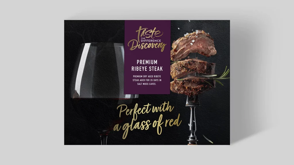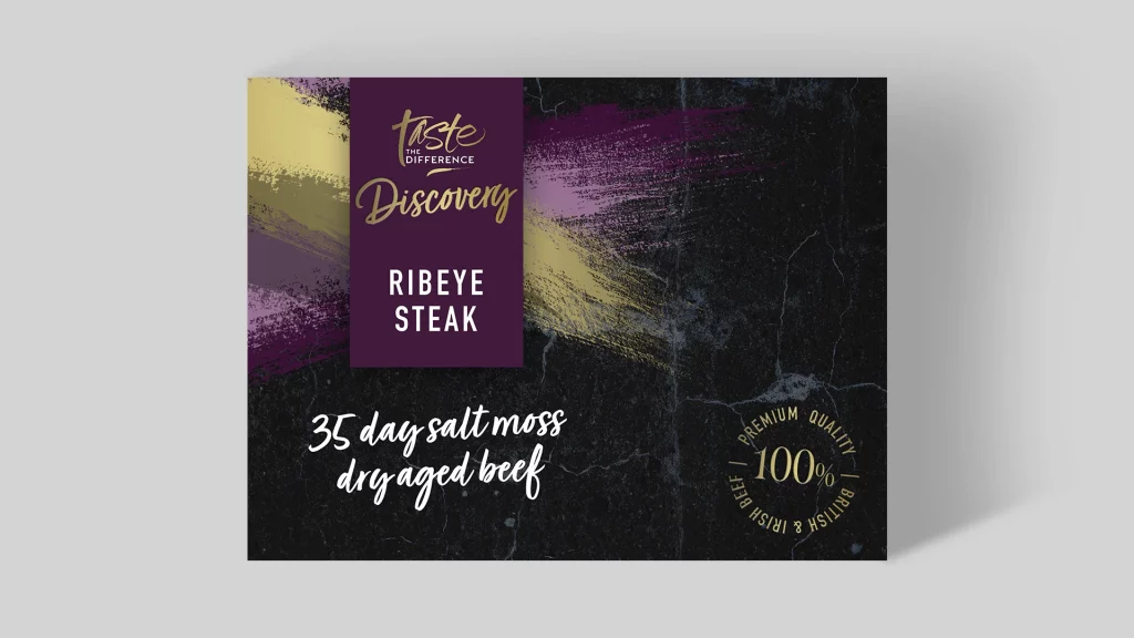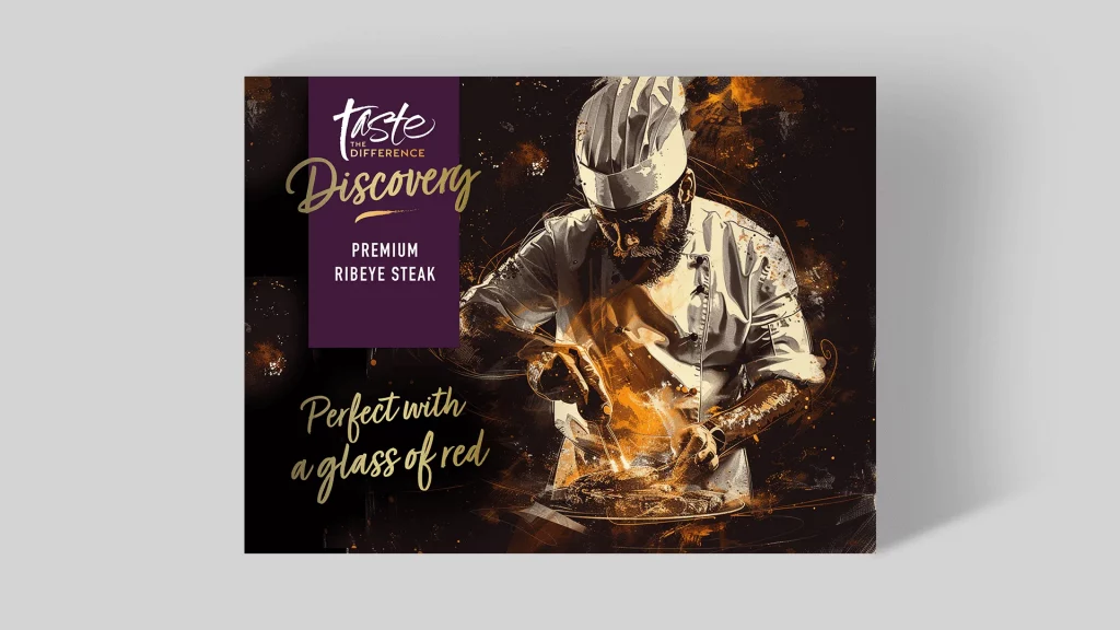 The new “Discovery” logo was created by integrating the well-known “Taste the Difference” logo with an elegant serif typeface for “Discovery,” effectively distinguishing the new range. The packaging combined brand consistency with enhanced visual features, creating a sophisticated shelf presence that drew attention. Rich colours, a clean layout, and tactile elements conveyed the premium quality of the product, positioning APB’s beef as a memorable part of Sainsbury’s premium offerings.